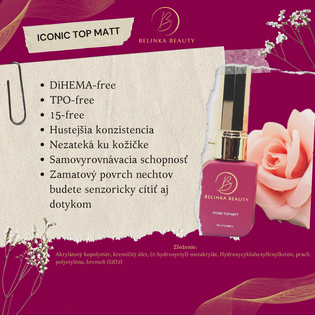 Iconic Top Coat Matt is a non-bleeding top matte final step of your gel manicure, which perfectly covers your design in a velvety matte finish without unwanted bleeding.
